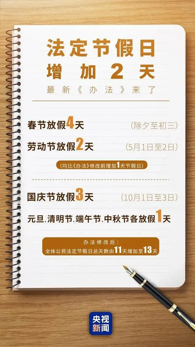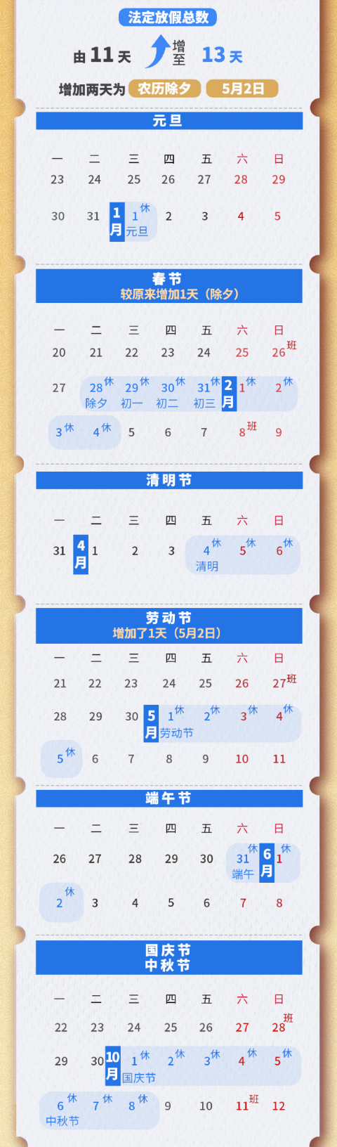 元旦、清明节、端午节、中秋节分别放假调休或连休3天(如逢周三则只在当天放假)
